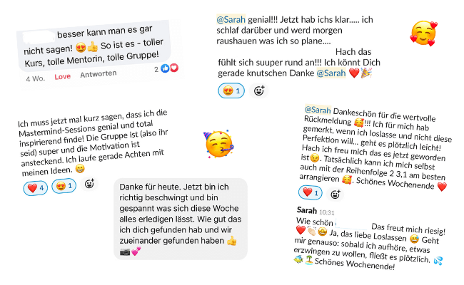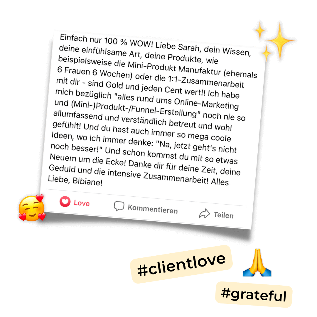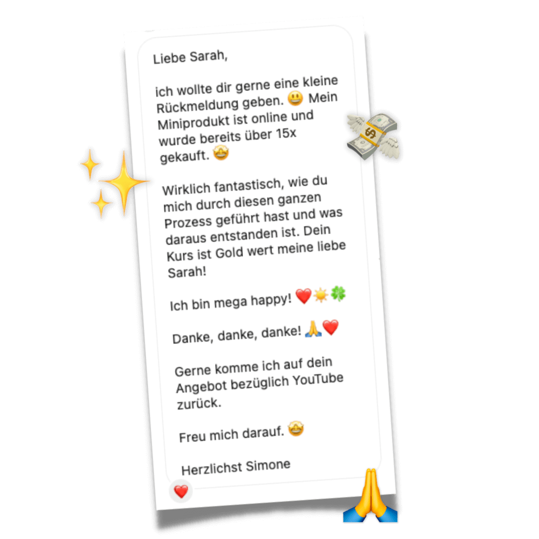 Für mich ist Sarah eine meiner stabilen Säulen, bei der ich mir immer wieder Rat und Unterstützung hole. Ohne sie wäre ich heute nicht da, wo ich heute bin. Der Launch meines Miniprodukts steht bevor und ich liebe es jetzt schon! Von ganzem Herzen DANKE
